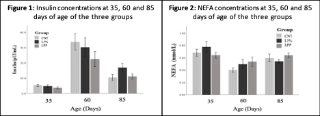 Blood samples were taken at 35, 60, and 85 days of age from the ear marginal vein. The samples were immediately centrifuged at 3500 rpm for 15 minutes, then plasma and serum were stored until the assay. From each sample, insulin, glucose, and non-esterified fatty acids (NEFA) were analysed as previously described by Menchetti et al., 2018.