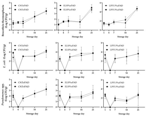 Total viable counts (TVCs) for Enterobacteriaceae, Escherichia coli, and coagulase-positive staphylococci were quantified using Petrifilm (3M, St. Paul, MN, USA). Pseudomonas spp. were cultured on Pseudomonas Agar Base (Biolife Italiana s.r.l., Milan, Italy) with CFC Pseudomonas Supplement (Biolife Italiana s.r.l., Milan, Italy) and incubated at 25 C for 48 h. Brocothrix thermosphacta was grown on STAA Agar Base (Biolife Italiana s.r.l., Milan, Italy) supplemented with STAA Selective Supplement (Biolife Italiana s.r.l., Milan, Italy) and incubated at 22 C for 48 h.