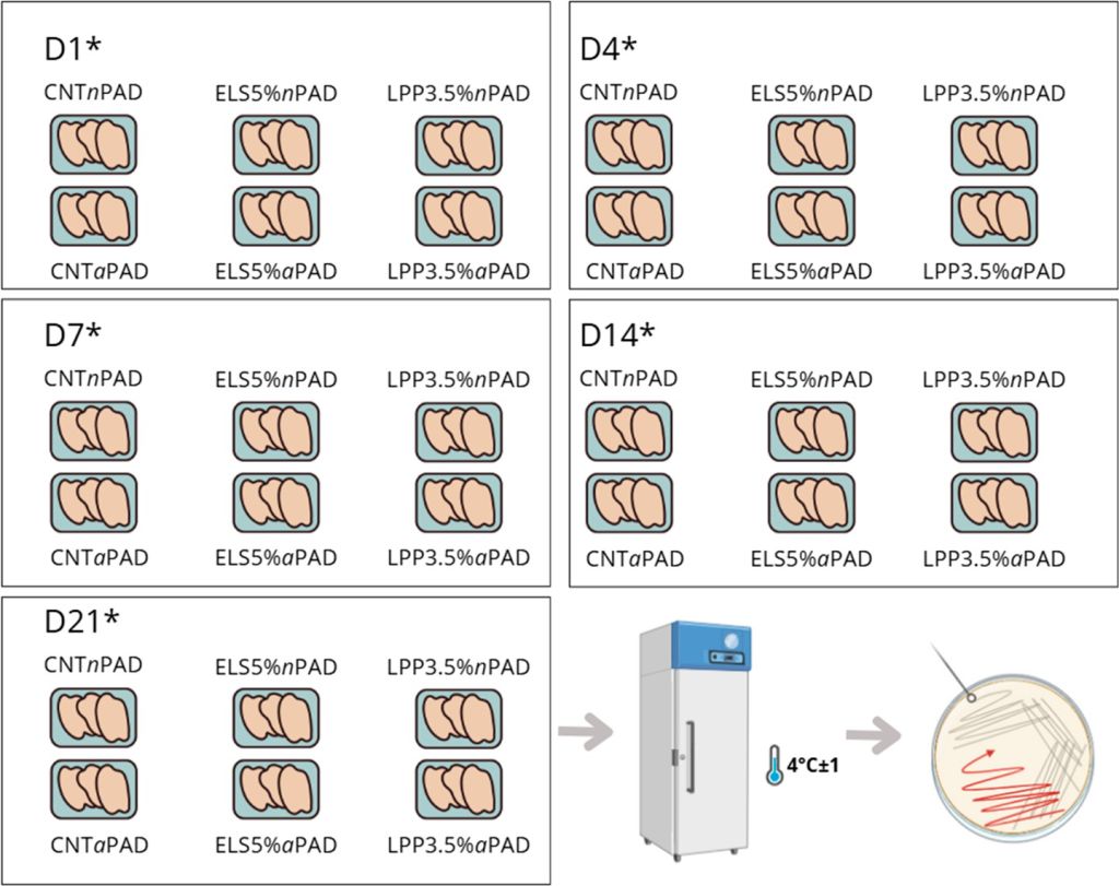 Figure 1. Microbiological and chemical shelf life experimental protocol. * For each analysis time point, 10 samples per group were analyzed.