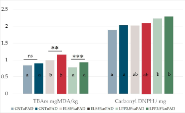 The average pH across the three feed groups was 5.97 ± 0.02 as mean ± standard error (SE), with no significant differences detected among them. Relatively high pH values around 6.0 did not appear to pose issues for the shelf life of rabbit meat, as reported by Pereira et al. [24]. However, when considering the overall effect of the PADs on pH, the nPAD group demonstrated a significantly lower value compared to the aPAD group. Notably, this difference was specifically observed in the CNT group, as highlighted in Table 1, which presents the interaction effects among the feed groups (CNT, ELS 5%, and LPP 3.5%) and the two PAD conditions on physical parameters. This difference suggests that aPAD effectively minimizes pH decline, potentially reducing microbial activity responsible